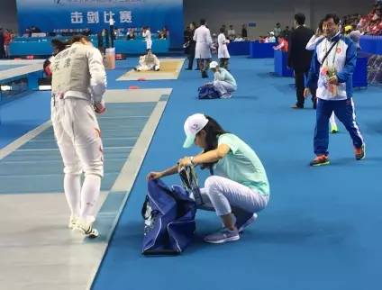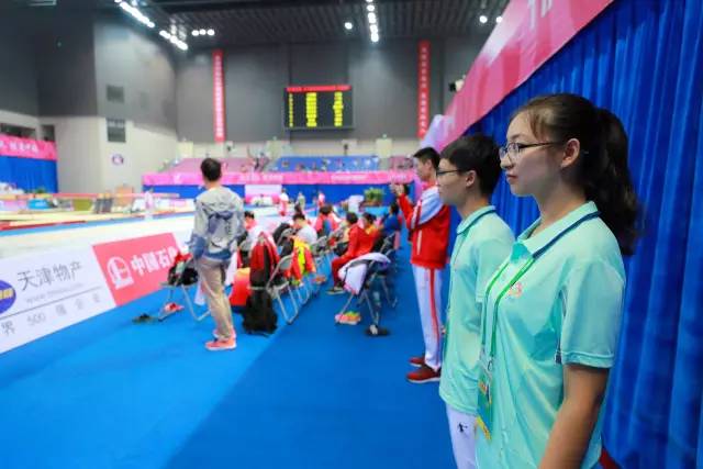 击剑赛事的志愿服务由天津体育学院的志愿者负责,他们每日早早起床,到赛场上做好赛前准备,尽一切全力为比赛做好准备。没有抱怨,他们用热情、坚守、认真感染了整个赛场。