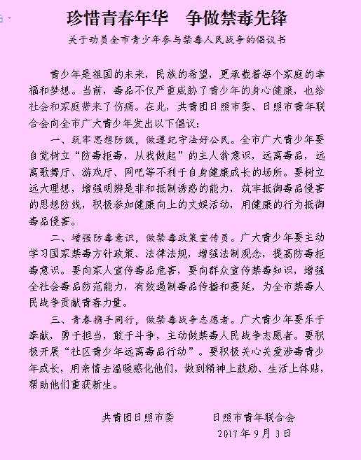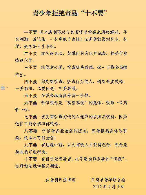 为进一步加强青少年禁毒宣传教育,动员和组织广大青少年积极参与禁毒人民战争,9月3日上午,团日照市委、日照市青年联合会在香河街道高新社区开展“珍爱青春远离毒品——青年志愿者禁毒宣传进社区”活动。
