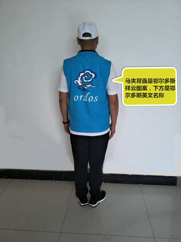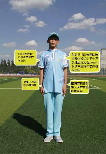 本次大会志愿者服饰的设计上力求将草原元素和谐统一的融入到各个细节当中。服装主体蓝底白纹和蓝白过渡色的运用分别代表大草原的蓝天白云。服装运用蒙古吉祥云纹,体现经典的蒙古右侧大襟的造型,整体服装保留了蒙古族服饰经典的元素。防风外衣和马甲背部的“e”形祥云,代表着“鄂尔多斯”汉语拼音的首字母代表一朵蓝白交汇的祥云,代表本次大会的举办地——鄂尔多斯。