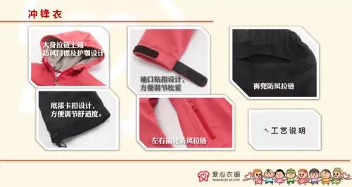 中国青少年发展基金会爱心衣橱基金是由多家主流媒体、多位主持人、编导、记者、企业家、名人明星共同参与推进的一项爱心公益行动。以“用爱心呵护孩子冷暖”为使命,通过各种渠道,汇聚社会各方力量筹集资金,为偏远、贫困地区的孩子们定制防风防雨保暖透气的新衣服,并倡议社会各界爱心人士关注贫困地区儿童的心灵关爱和教育问题。截至2016年12月,爱心衣橱已经将爱心企业、爱心人士奉献的温暖传送给来自28个省,304个区县的1409所学校,共计161896个孩子穿上了温暖新衣。其中为四川287所学校,37821名孩子每人送去了防风防雨保暖透气的冲锋衣裤两件套。