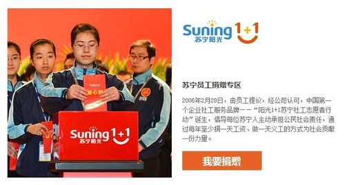 多年来,苏宁不仅积极推动中国零售行业的发展进步,同时作为一家社会化企业,苏宁更积极履行社会责任,以实际行动支持社会公益。通过“阳光1+1”行动、“苏宁溪桥工程”、“筑巢行动—苏宁校舍”等公益活动,逐步发展成为以“阳光1+1” 理念为主体,以社会专业型公益扶贫和持续再生型公益扶贫为两翼的“一体两翼”新公益模式,成立27年来,累计公益捐赠已超11亿元人民币,广泛投入在救灾、教育、扶贫、环保等诸多领域。
