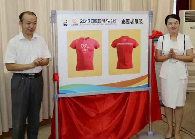 新闻发布会上,首先由市体育局党组成员、副调研员单体炜与团市委副书记李杨共同发布日照银行·2017日照国际马拉松志愿者服装。