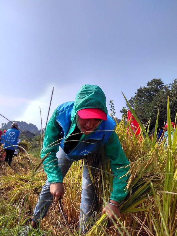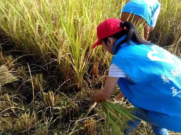 这17名志愿者中,有不少是第一次接触割稻子这项农活。他们在乡亲们的示范和指导下,先用杂草练手,接着实地操作,从最开始三四刀才能割一簇到后来一刀割下,不一会儿就掌握了割稻子的技术要领,还开始了割稻子比赛,看谁割得又快又好。