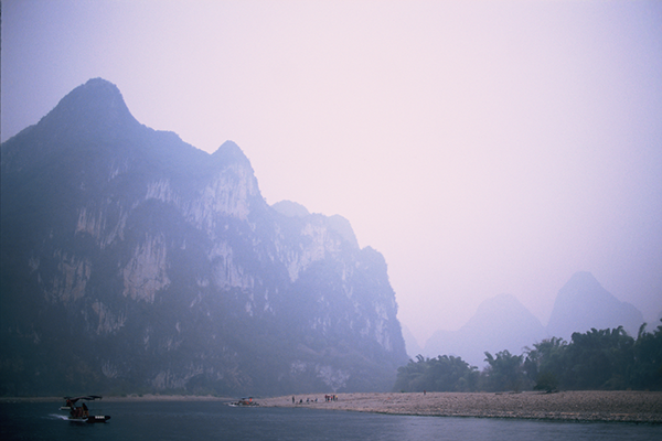 在广西阳朔的漓江漂流,前面是九马画山