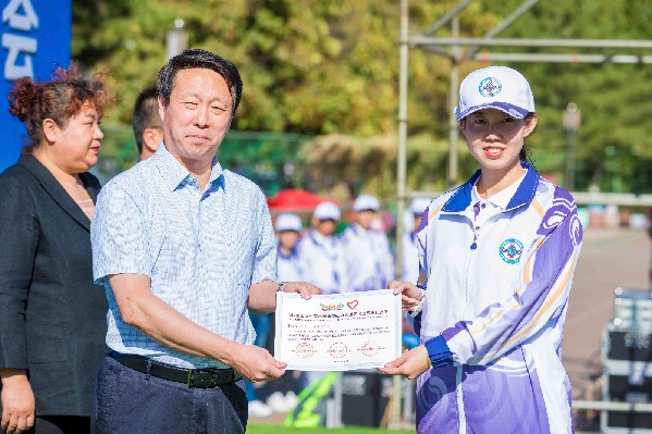 与会领导共同为志愿者代表配发装备
