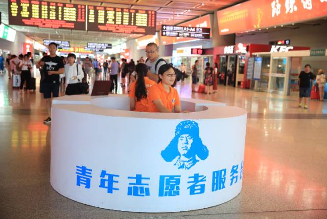 在济南西站站内青年志愿服务站,志愿者为来济旅客提供引导咨询、购票服务、手机充电等志愿服务,让来济旅客体会家一般的温暖。