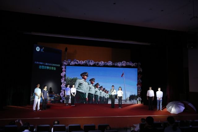 故事分享环节首先出场的是展演志愿者代表,建工学院2016级本科生张营政。全运会之后,身边的朋友更喜欢称呼他“D28”,这个对于参演师生再熟悉不过的“点位号”早已远远超出了它本身的实用价值,被所有人赋予了新的含义,成为了共同的坚守“图腾”。“人在伞在,从那一刻起,伞就如同枪之于士兵,成了我们排练生活的第一要义”。高强度训练所带来的伤痛,连续几个八拍的蹲起,除了无数次开闭和甩伞,动作、节奏、体态、表情、幅度,都在酸痛的膝盖和胳膊中体现的淋漓尽致。雨后复斜阳,关山阵阵苍,为了同一个目标,坚守在一起。所有的经历如今已然成为全体参演师生的闪亮勋章。