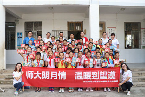江西师范大学研支团全体成员在望谟县部分乡镇校园里给留守儿童们发放了来自母校赠送的800余份爱心月饼。赠送月饼时,支教团队员们和孩子们进行愉快地交流,在聊天的轻松氛围中鼓励他们努力学习,学会感恩。孩子们对研支团成员说,能收到这样有意义的中秋节礼物觉得非常高兴和感动,让他们感受到中秋节的温暖。