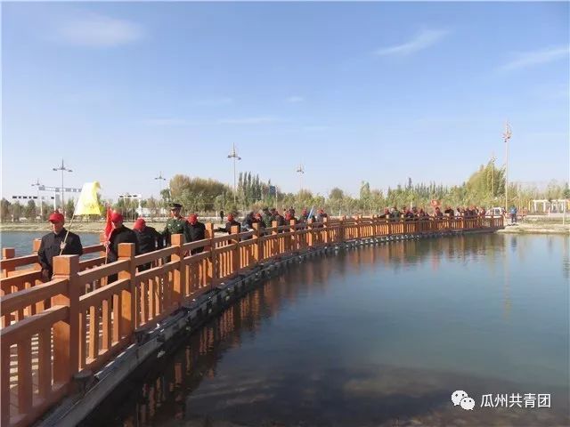 玄奘广场,团旗飘扬。“小红帽”志愿者与老人话家常,了解老人的身体及日常生活情况。老人说起来,能够有机会结伴出游,看到道路越来越宽,绿植越来越多,水天相接,瓜州越来越好,脸上笑意盈盈。