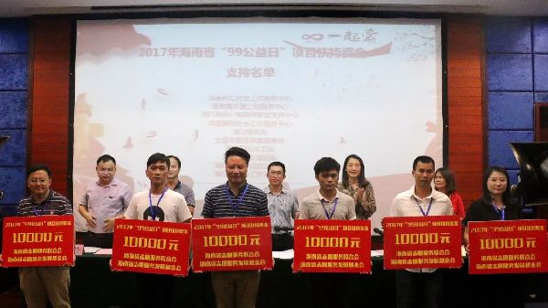 仪式第四项议程由向2017年海南省“99公益日”优秀项目颁发扶持资金。按照团中央统一部署,2017年8月,团省委、省志愿服务联合会、省志愿服务发展基金会联合开展了海南省青年社会组织“99公益日”活动。全省有30多个社会组织参与,共筹集善款940余万元,带动十万余人次在线捐款。海南省志愿服务发展基金会为此次活动中表现突出的社会组织提供本次扶持资金共15万元。