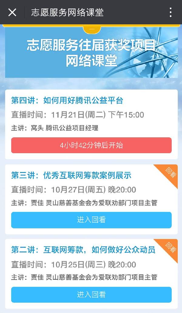 网络培训课堂前面三讲反响热烈,课堂气氛非常活跃!第四讲《如何用好腾讯公益平台》将于今天下午15:00准时开讲,下午一起看直播哦!