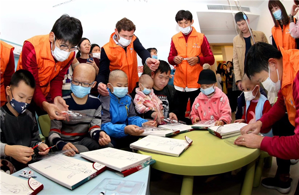 图说:博阿斯等和白血病患儿互动 官方图
