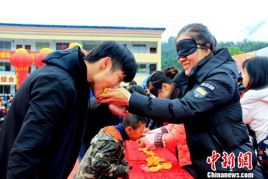 图为蒙眼吃锌橙趣味比赛。 吴苏梅 摄