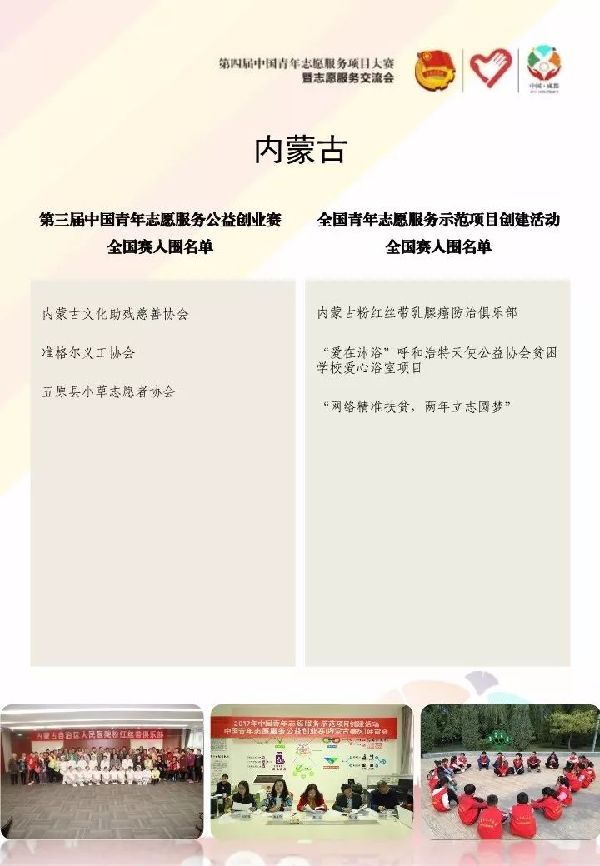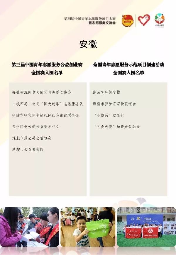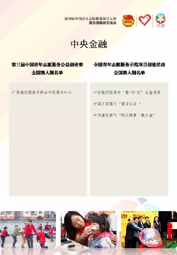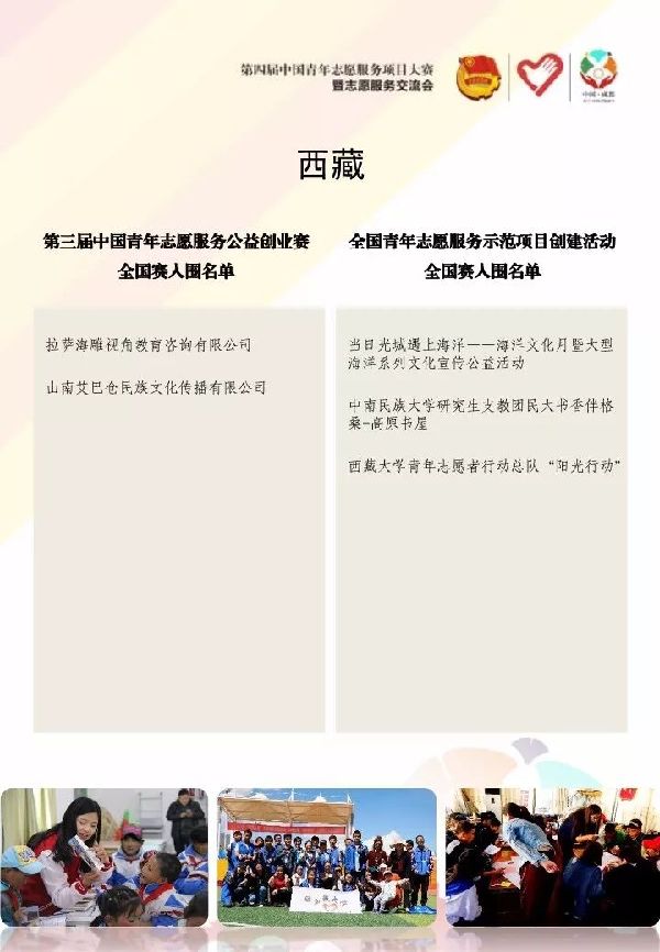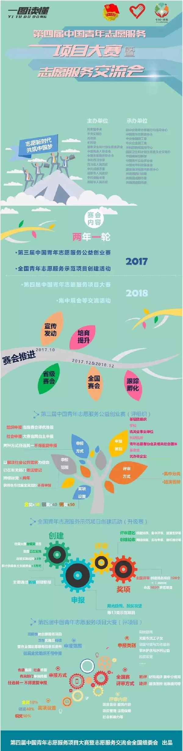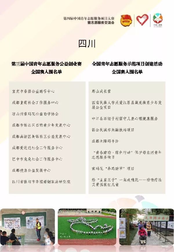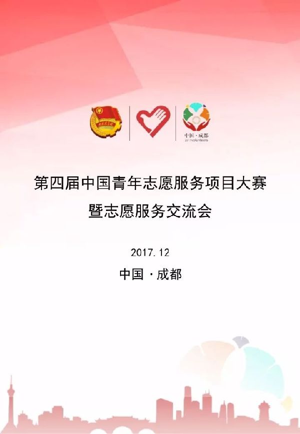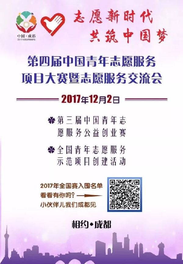 第四届中国青年志愿服务项目大赛暨志愿服务交流会2017年集中活动将于2017年12月2日至3日在成都举行。此次赛会由团中央、中央文明办、民政部、水利部、国家卫计委、中国残联、中志联、四川省委、四川省政府、成都市委、成都市政府主办。赛会两年一轮,2017年举办公益创业赛和示范项目创建活动。