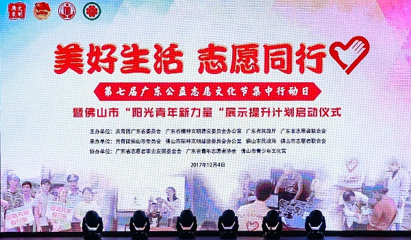 今日上午,第七届广东公益志愿文化节集中行动日暨佛山市“阳光青年新力量”展示提升计划在佛山市启动,省市志愿服务组织及团体负责人和志愿者代表约350人参加现场活动,学习宣传贯彻党的十九大精神,共同庆祝第32个国际志愿者日的到来。省政协原党组副书记、副主席、省志愿者联合会会长唐国忠,团省委书记池志雄、副书记梁均达,团中央社会联络部副部长李森,佛山市委常委、组织部部长杨朝晖以及省文明办、省民政厅、省志愿者联合会和佛山市相关负责同志等出席活动。