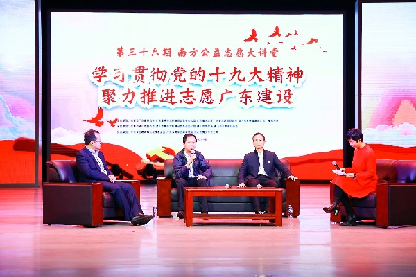 仪式后,主办单位还举办了第36期南方公益志愿大讲堂,邀请了谭建光、李森和王忠平等知名专家学者和公益达人,立足“学习贯彻党的十九大精神,奋力推进志愿广东建设”开展主题研讨和交流,并通过网络直播方式为全省志愿者送上一场思想的盛宴。