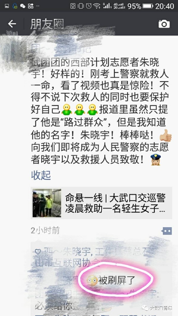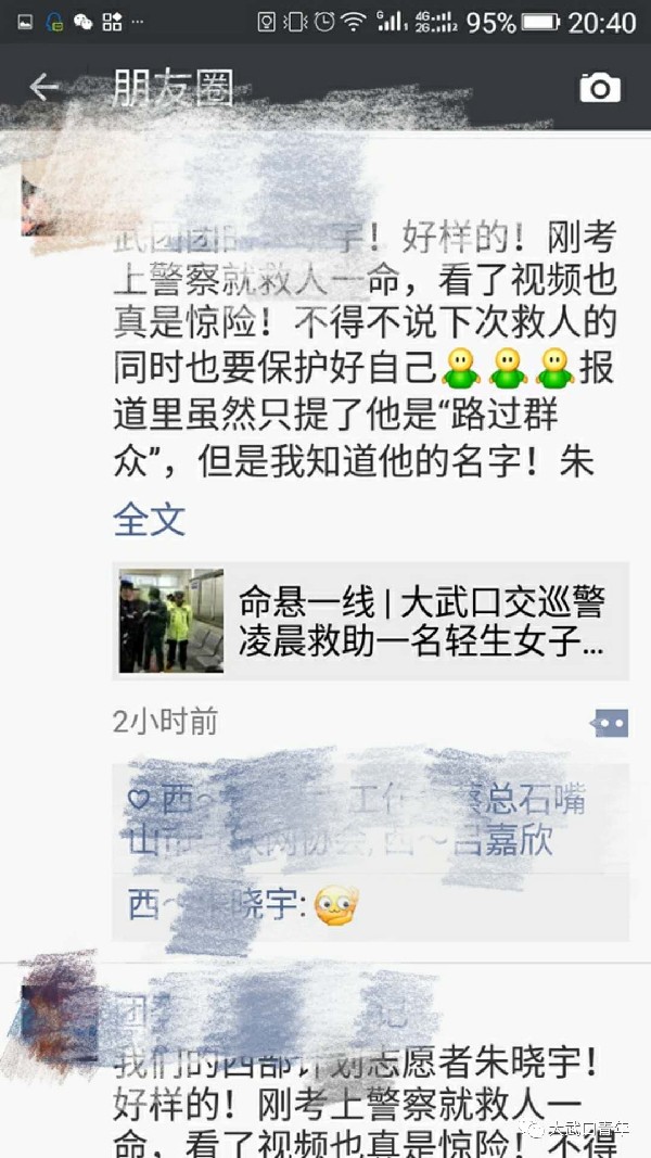 看着被刷屏的朋友圈,这个大男孩有些不好意思,他说这些都是该做的。在“平安石嘴山”的公众号上,朱晓宇评论到,这是一次警民通力合作的共同救援行动,因为当时就在附近,所以我和团委的两个朋友以及一位老大爷奋不顾身地冲上去,我一口气爬到阳台,和另一位先爬上阳台的大叔一起拉着那位女子,但是阳台跪着拉拽受力点不好,只能等待警察一起救援。两名警察和我们两名群一起救援的。我非常佩服那位大叔,腿抽筋了依旧不放手,非常值得我学习。