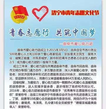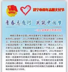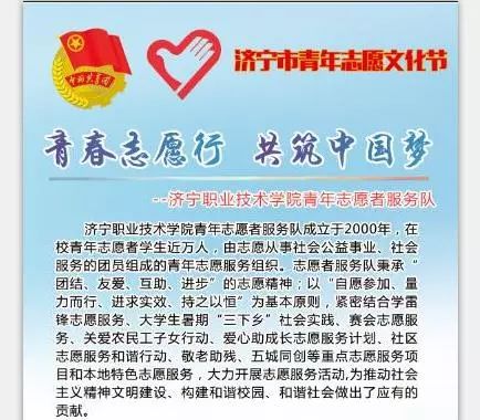 为在全市进一步弘扬“奉献、友爱、互助、进步”的志愿精神,传播志愿理念,促进志愿服务组织互相交流,近日,济宁团市委在万达广场举办了以“青春志愿行 共筑中国梦”为主题的济宁市青年志愿文化节。