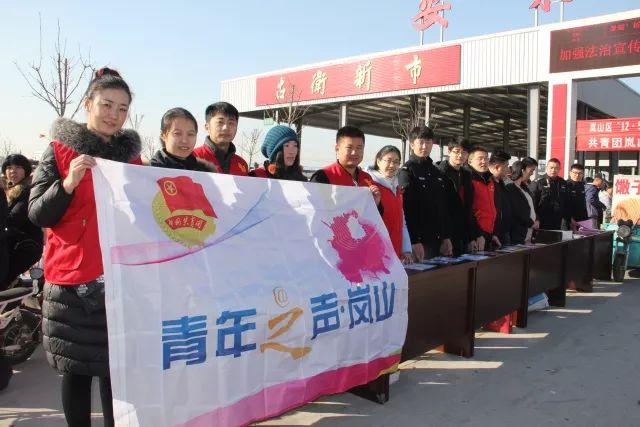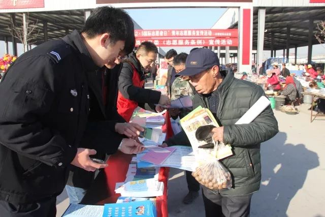 岚山区团委在安东卫大集宣传《志愿服务条例》、禁毒、法治等知识,并呼吁青年积极参与各类志愿服务活动。