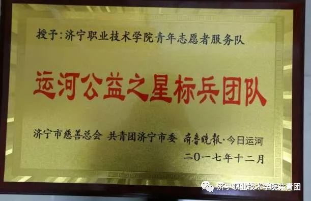 济宁职业技术学院青年志愿者服务队先后荣获山东省五四红旗团委a、山东省“雷锋号”先进集体、 山东省大中专学生志愿者暑期“三下乡”社会实践活动先进单位、优秀服务队,济宁市优秀志愿服务组织、济宁市红旗团委、济宁市关爱农民工子女志愿服务行动先进集体、第二十三届省运会志愿服务先进集体、第九届省残运会志愿服务先进集体、运河公益之星标兵团队 等荣誉