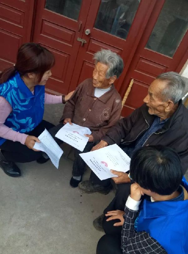 桓台团县委开展“金晖助老—送健康”活动,青年志愿者崔芸青为老人周汝森送去“金晖助老”体检表