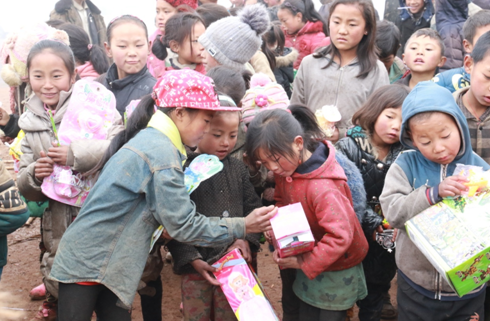 乃解村的孩子们年龄不一,脸冻得通红,手上基本上全是冻伤,许多孩子都没有穿袜子。志愿者们立刻按照分工进行了物资发放。有的孩子拿到发放的衣物后就马上穿在了身上,还有的孩子拿着手里的玩具和小伙伴儿小声地探讨、有的孩子拿着手里的新书包特别珍惜,她们脸上都带着腼腆的笑,但都特别开心满足。在场的家长们,也用彝族语感谢着志愿者们。