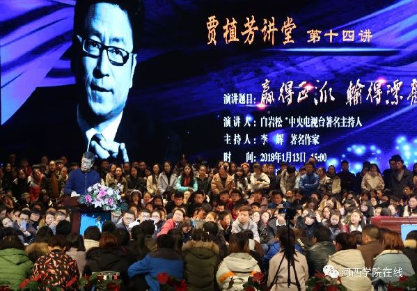 1月13日下午,中国青年志愿者协会副会长、央视著名主持人白岩松先生应邀做客河西学院贾植芳讲堂,做了题为“赢得正派,输得漂亮”的演讲。演讲由贾植芳讲堂特邀主持人、著名作家李辉先生主持,演讲现场热烈,精彩不断。