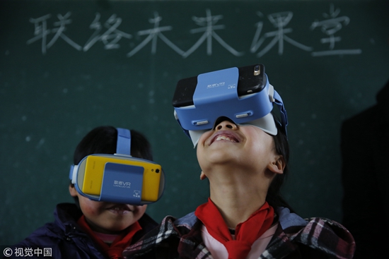 在湖南省隆回县三阁司镇石笋小学,支教志愿者为孩子们带来了特殊的“希望工程一堂课”——VR体验课。学校里的留守儿童戴上VR眼镜,置身气势恢弘的北京故宫和奇妙神秘的海洋世界,感受外面世界的精彩。视觉中国供图