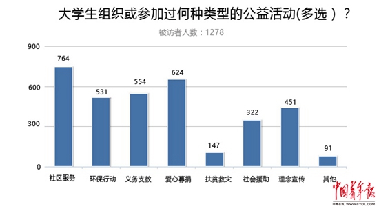 近期,中国青年报·中青在线面向全国高校参与过公益活动的大学生发出调查问卷,收到1278份有效答卷。在问及大学生组织或参加过何种类型的公益活动(多选)时,59.8%的受访者选择了社区服务,48.8%的受访者选择了爱心募捐,43.3%的受访者选择了义务支教,41.5%的受访者选择了环保行动,35.3%的受访者选择了理念宣传(公益传播),25.2%的受访者选择了社会援助,11.5%的受访者选择了扶贫救灾。另外,还有7%的受访者选择了其他选项,认为蚂蚁森林、网络公益传播、图书漂流、义务献血、赛事活动志愿者、流浪动物救助等都属于公益活动。