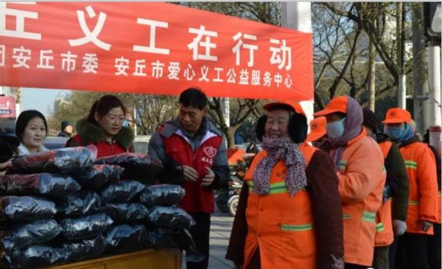 寒冷冬季,安丘志愿者们走上街头,为环卫工人免费发放防冻耳罩,环卫工人自发排成一队,从志愿者手中接过耳罩,脸上洋溢着幸福的笑容。