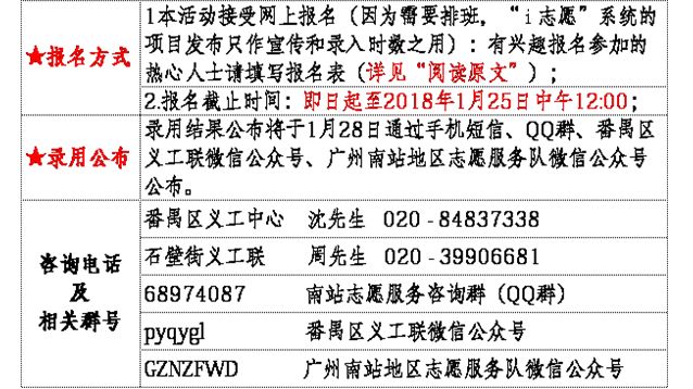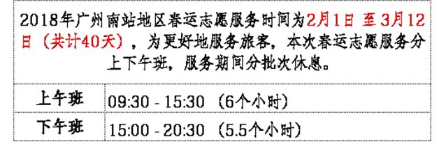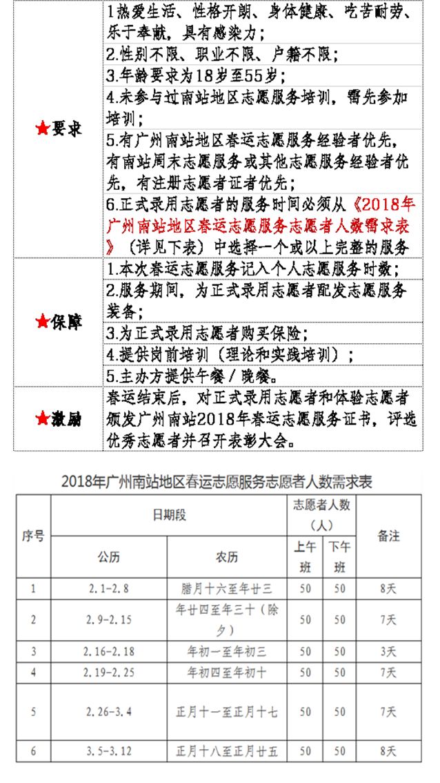 为弘扬“奉献、友爱、互助、进步”的志愿服务精神,发挥广大志愿者在广州地区春节旅客运输工作中的积极作用,缓解广州南站的春运压力,确保2018年春运期间广州南站地区旅客运输工作安全有序,营造安全、文明、和谐的春节氛围,共青团广州市番禺区委员会、共青团番禺区石壁街工作委员会、番禺区义工联、石壁街义工联现向社会各界 招募春运志愿者。具体事项如下:
