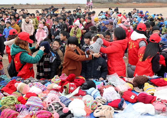 1月23日,江西抚州,“巾帼志愿者”正在把围巾和帽子送给学校的留守儿童。当日,江西省抚州市东乡区妇联组织该区妇女开展“针心针意,传递爱心,延续温暖”活动,“爱心妈妈”们编织或购买围巾和帽子,为留守儿童送去冬日温暖。目前,活动已收到爱心织物近千套。何江华/视觉中国