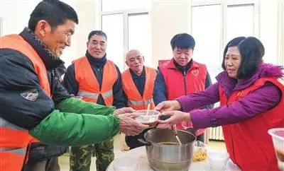 1月24日,山东省济宁市阜桥街道浣笔泉社区志愿者为辖区内的环卫工人送上热腾腾的腊八粥和大包子,让他们在寒冷的冬天感受到社区的关怀,同时网格站志愿者们对辖区内的五保户、独居老人、困难群众也送去一份爱心餐,让他们体会到社区的温暖。