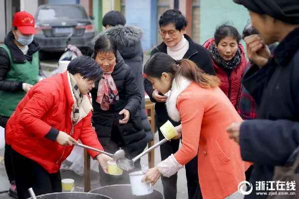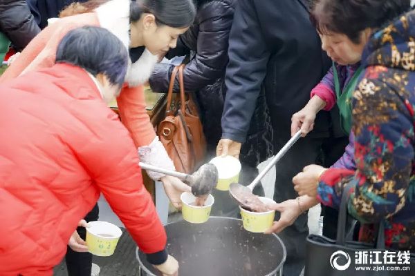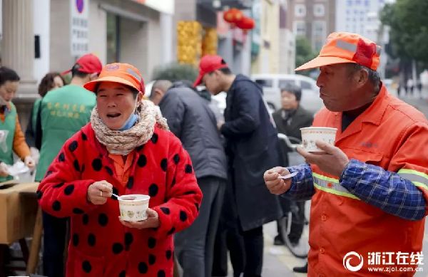 1月24日早晨,浙江省台州路桥的志愿者将连夜熬制的腊八粥,分发到环卫工人及行人手中,为他们送去一份冬日的温暖。