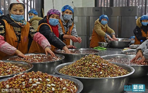 1月23日,陕西省西安市,几位志愿者正在忙碌着,为了迎接今年的腊八节,他们提前一个周就开始准备各种食材了,这次熬制腊八粥所用的食材有30多种,据工作人员介绍说,此次熬的粥可以免费供3万多人食用。