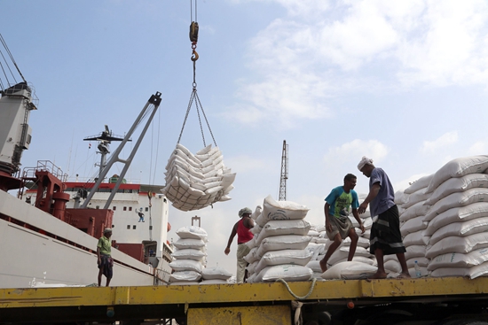 1月27日,在也门荷台达,工人在港口卸载联合国儿童基金会援助的粮食。根据联合国儿童基金会驻也门首都萨那的办事处1月发布的报告,也门内战迄今已造成逾5000名当地儿童死伤。报告呼吁有关各方尽快停止流血冲突,为当地儿童提供持续且无条件的保护和帮助。新华社/法新
