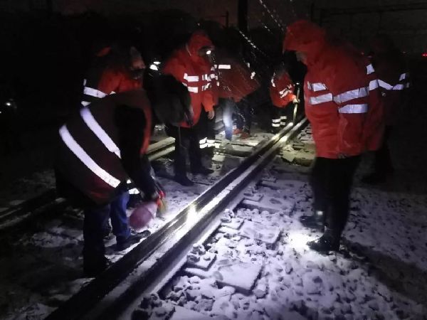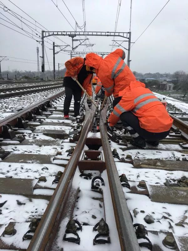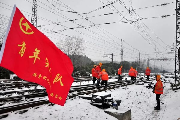 南昌电务段都昌信号车间青年突击队组织团员青年在工区管内线路进行扫冰除雪工作。