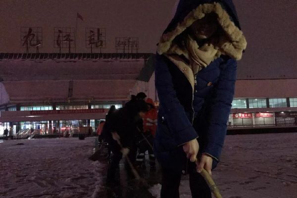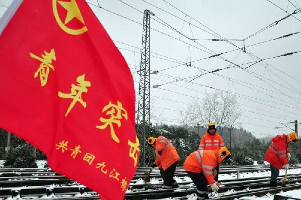 凌晨,九江车务段迅速组织青年突击队员在九江站前广场和股道扫雪。