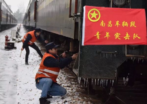 南昌南车辆段九江西运用车间组织青年突击队迅速启动打冰扫雪应急预案,做好打冰扫雪工作。