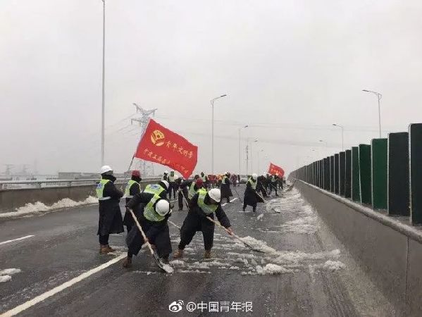 中建交通团委组织昌南大道项目青年志愿者30余人,带上铁锹扫帚等铲冰除雪工具,齐心协力在青山湖区英雄大桥共清理道2000余米,耗时8小时。南外环项目也积极投身活动中,项目动员20余人奔赴南昌外环高速清理道路500余米,用最快的速度抢通了冰冻路段。