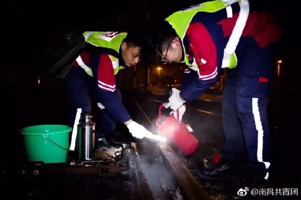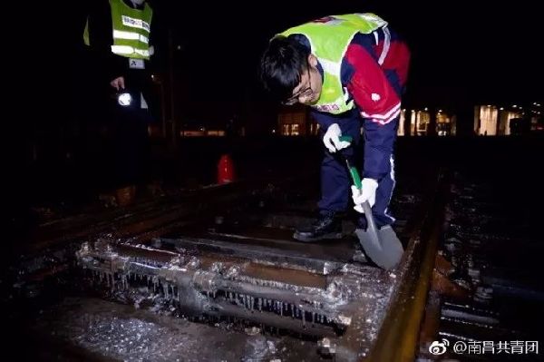 南昌轨道交通集团团员青年为保障地铁轨道道岔正常工作,每半小时确认一次道岔位置,判断是否冻住,一晚共检验道岔400次。如发现积雪结冰情况,将携带铲雪锹、除冰铲、工业盐、开水瓶、钢刷进行处理,每处理一组道岔,需要泼水撒盐、铲雪除冰共计20多分钟,期间还要一直处于弯腰状态。同时,青年文明号志愿者们分别在各轨道站点,开展除冰扫雪志愿服务活动,为路口撒盐除冰,铺设防滑草垫和麻袋。