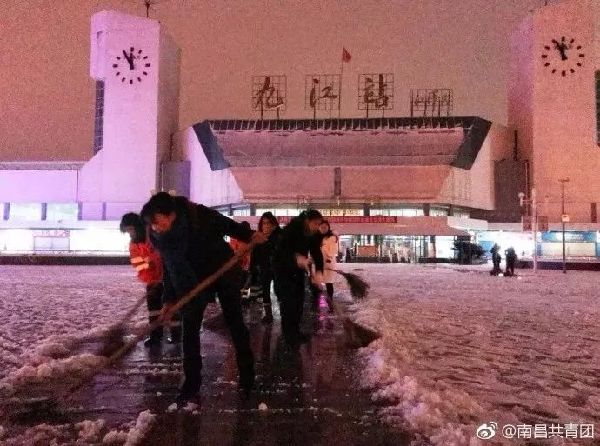 西湖区南站街道团委组织20余名青年志愿者在火车站周边开展除冰扫雪志愿服务活动。