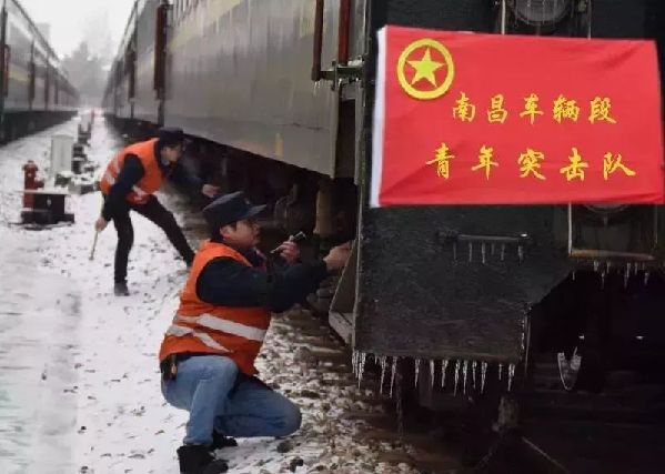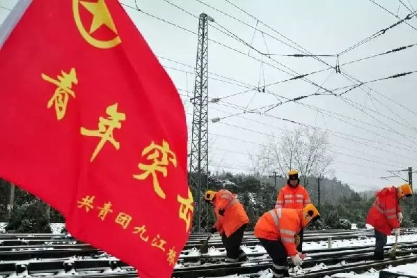 1月26日,江西中北部地区出现雨雪冰冻天气,对管内运输生产设备设施造成不利影响。九江、南昌、鹰潭等地区各系统16个单位36支青年突击队严阵以待,以雪为令,随时投入一线除冰扫雪。