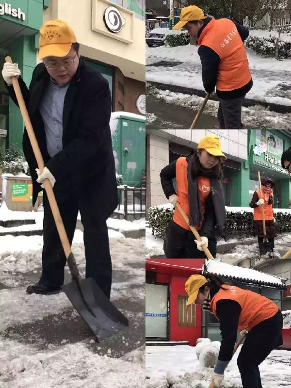 青年志愿者开展志愿除冰扫雪活动,帮助南苑社区清理小区路面,并为小区协调工业用盐,用于小区内融雪。