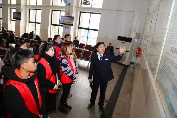 春运志愿者们言承诺、表誓言,表达自己参与春运志愿服务的决心和信心。随后在车站管理人员的引导下,参观了车站综控室、候车厅、服务台、安检口、售票厅等场所。最后,在2018“暖冬行动”春运志愿服务启动仪式横幅上签名,并合影留念。