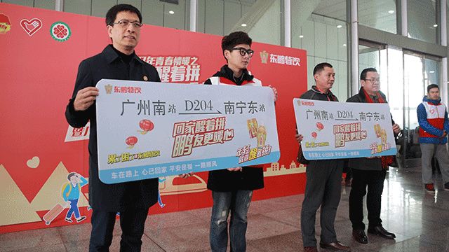 为助力异地务工人员顺利返乡,主办单位还于当天开行“共青团号”广西高铁专列免费送600名广西籍务工青年返乡,并为搭乘“共青团号”的返乡异地务工人员送上节日祝福和爱心礼包。同时,为更好地推进诚信建设和志愿服务制度化,今年团省委、省志愿者联合会继续联合相关爱心企业为广东星级志愿者提供免费搭乘高铁的激励优惠活动,累计共有22名星级志愿者报名参与活动并获得免费坐高铁资格,其中不乏曾在西藏那曲地区服务的西部计划志愿者、支持文莱地方建设的援外计划志愿者等优秀志愿者代表。