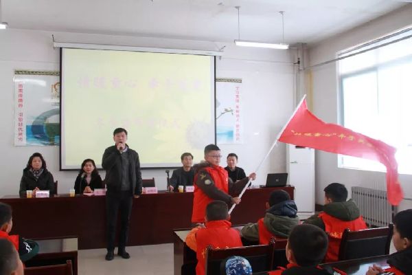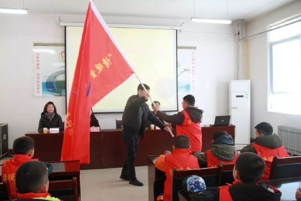 (团淄博市委副书记赵晓煜为冬令营授旗)