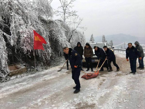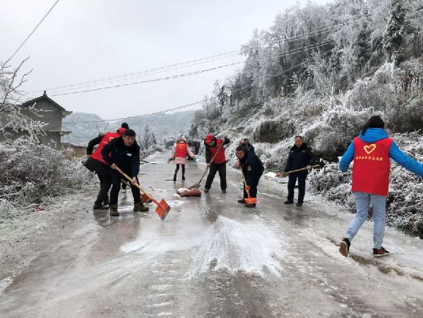 最近,受强冷空气影响,全县多地出现低温雨雪凝冻天气,给人民群众生产生活以及生命财产安全带来严重影响,为了确保道路畅通,1月26日到29日,团锦屏县委组织各乡镇团委积极组织广大社会青年志愿者积极参与抗凝冻、保交通行动。在零下2-5度的天气下除雪除冰,青年志愿者有的撒盐,有的用锄头、铲子在容易结冰的道路上,在洁白的山林间留下一串串忙碌的身影。青年志愿者的除雪工作,确保外出务工人员回家的希望之路畅通无阻,早点感受到回家的幸福之情。