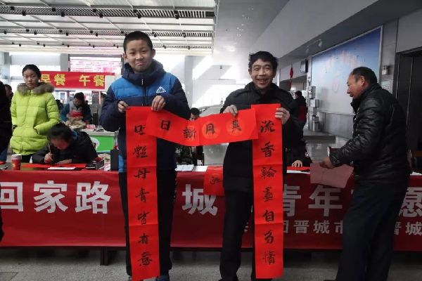 此外,晋城市青少年活动中心、晋能集团晋城公司青年志愿者分会、姜玉坤眼镜青年志愿者分会组织青年志愿者开展送春联(送祝福)、送元宵、清洗眼镜等主题服务活动,让旅客在温馨、方便、周到的服务中顺利感受家乡的温暖。