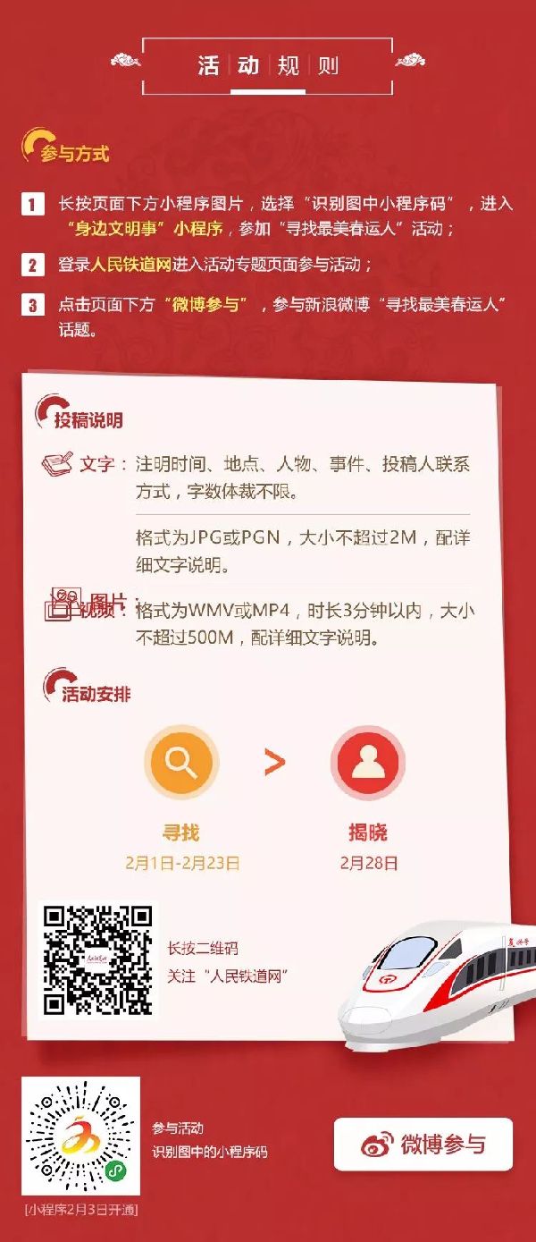 2月1日至28日期间,中国文明网及“两微一端”、《人民铁道》报、人民铁道网开设专栏集中展示网友和读者投稿。